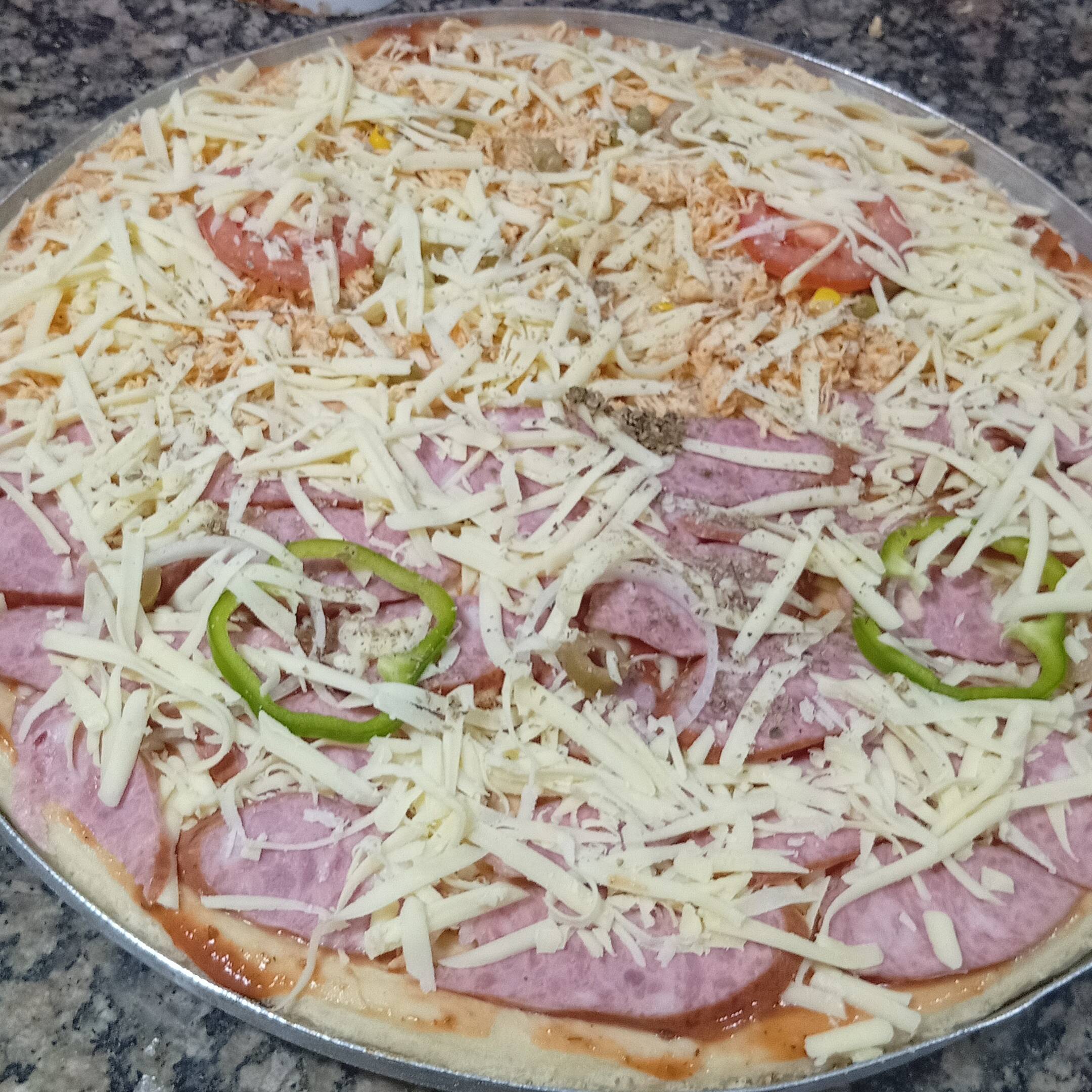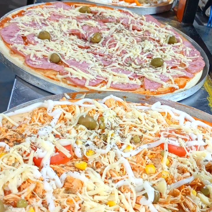 Mussarela, frango, catupiry, molho, milho, ervilha, tomate, azeitona e oregano.
