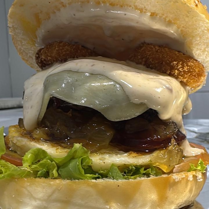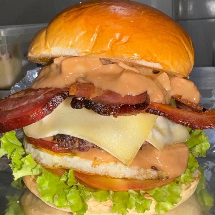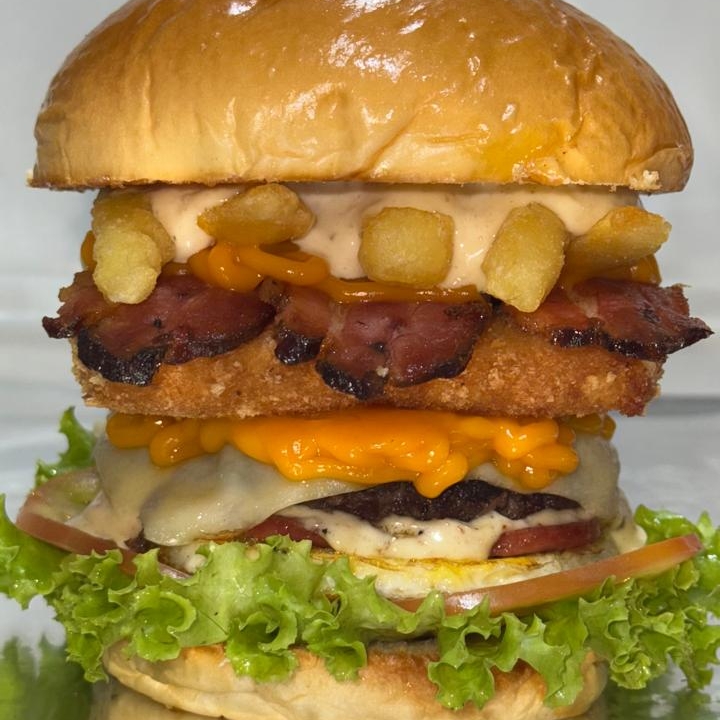 PÃO, SALADA, OVO, CALABRESA, MOLHO BACON, CARNE 130G, QUEIJO FATIA, BACON, DISCO DE QUEIJO, MOLHO CHEDDAR, BATATA FRITA, CEBOLA CRISP.