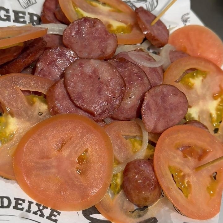 Pão, salada, ovo, calabresa, carne 130g, queijo fatia, bacon e molho de palmito