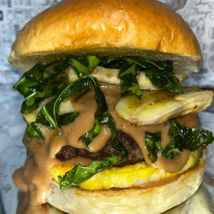 PÃO, OVO, CARNE 130G, QUEIJO FATIA, BANANA, COUVE CRISPY E MOLHO BIC.