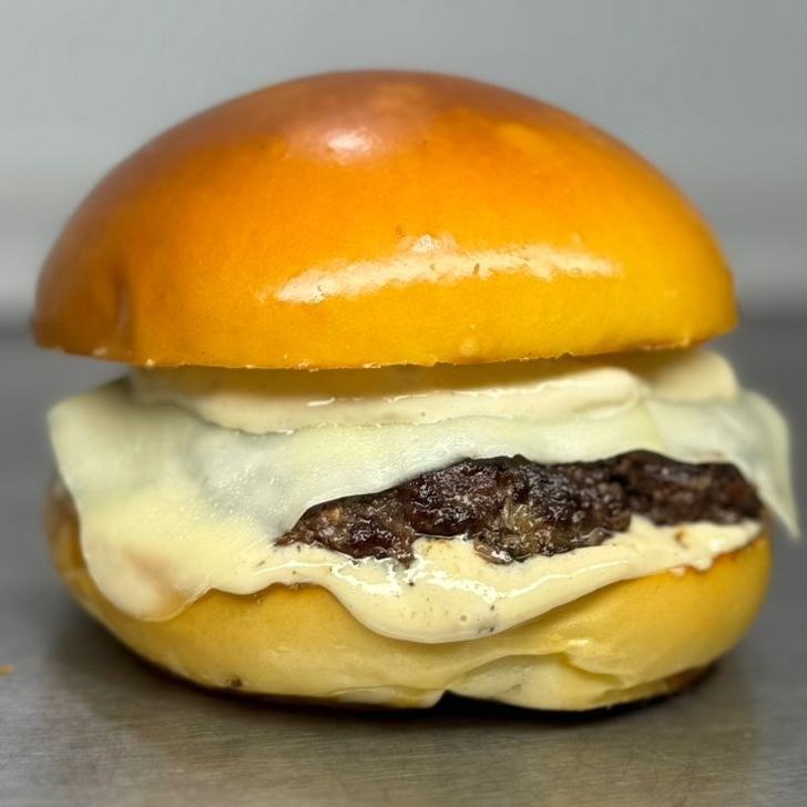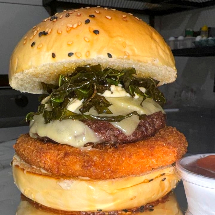 Pão, carne 130g, queijo fatia, catupiry empanado, couve crispy e geleia de pimenta
