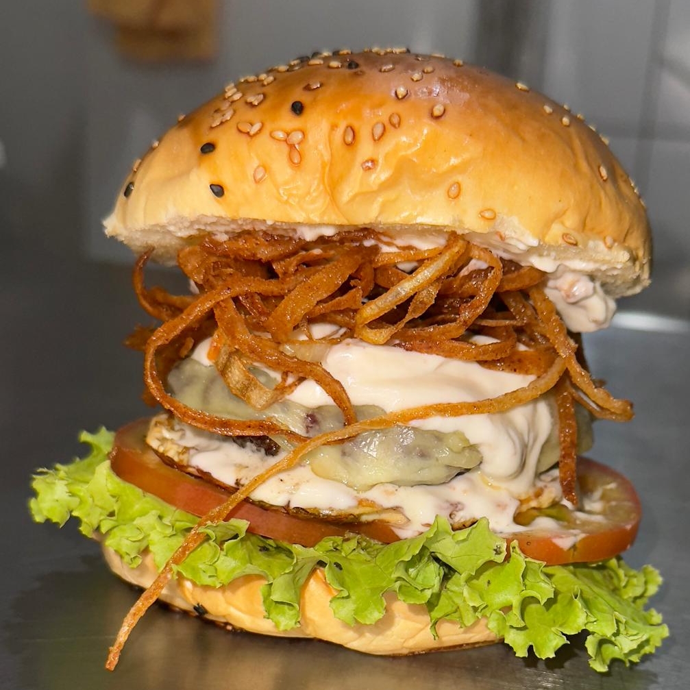 Pão, salada, ovo, carne 130g, queijo fatia, cebola crispy e molho cream cheese