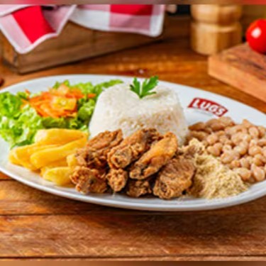 Prato de Trix (corte especial da tulipa crocante) com o nosso tempero secreto, acompanha arroz, feijão, farofa, a inigualável e exclusiva batata belga frita e salada (alface, cenoura e tomate).