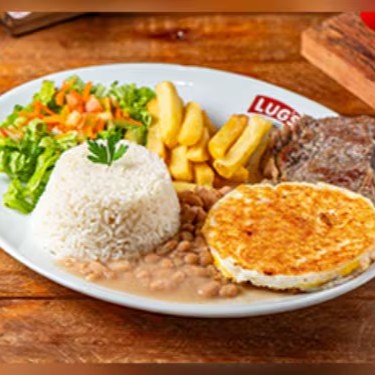 Contra filé usado na casa acompanha dois ovos fritos, arroz, feijão, batata e salada.