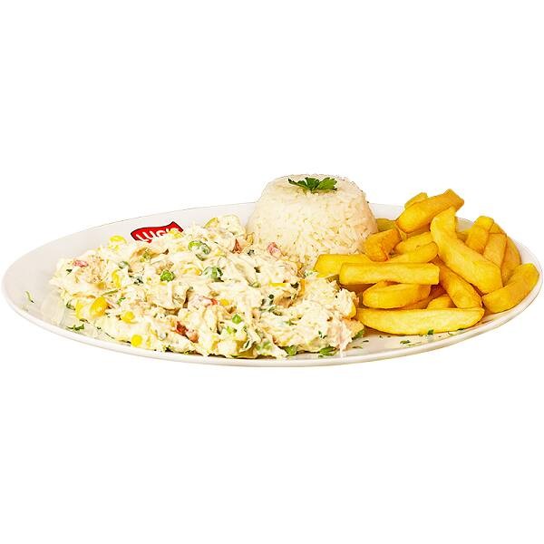 Acompanha arroz, salada, batata e arroz.