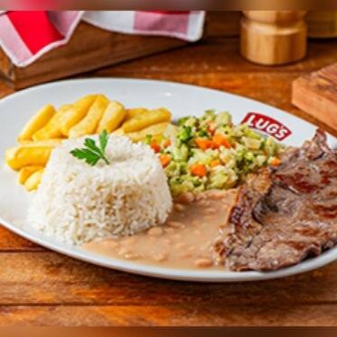 Contra filé usado na casa acompanha arroz, feijão, cebola refogada especial, batata e salada.