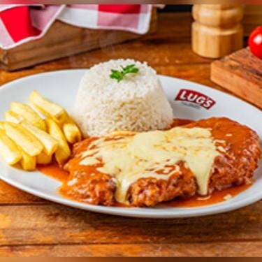 Versão especial da tradicional parmegiana de frango, feito com molho artesanal de tomate acompanha arroz e batata crocante.
