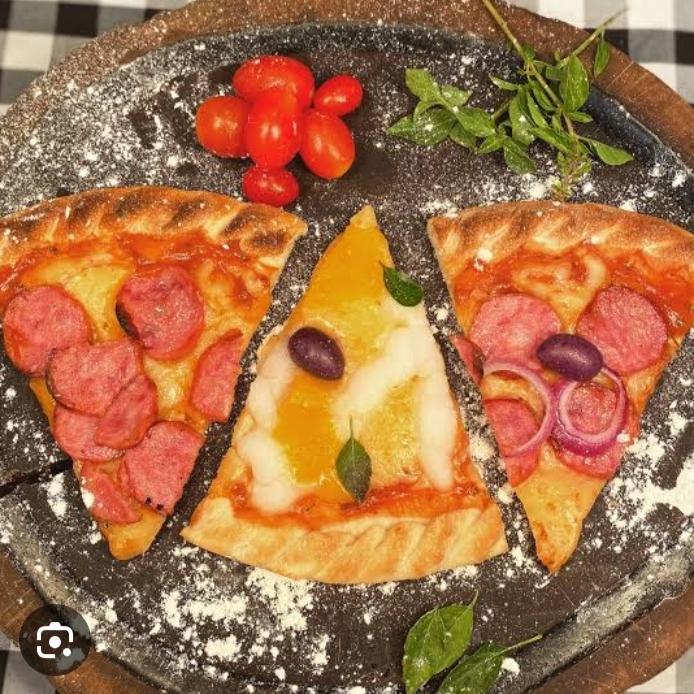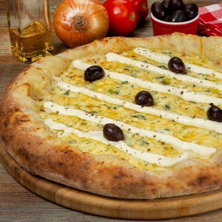 Massa Fresca, mussarela, molho, requeijão, queijo prato, parmesão, azeitona e orégano