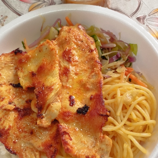 Filé de frango,arroz, macarrão, feijão e farofa.