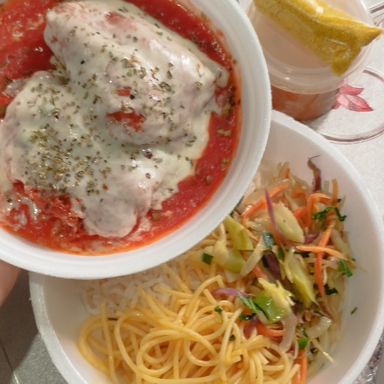 Frango empanado com molho vermelho e queijo e orégano , arroz, macarrão, feijão e farofa.