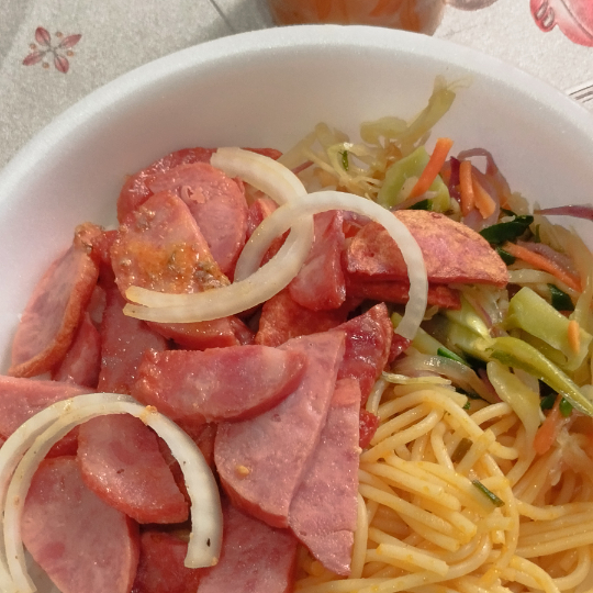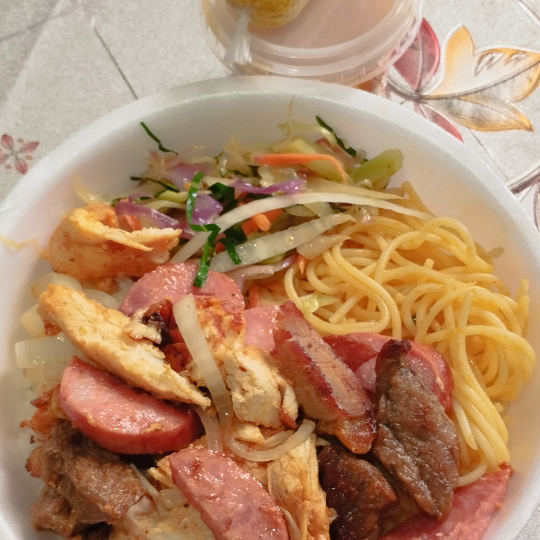 Carne,frango,calabresa , arroz, macarrão, feijão e farofa.