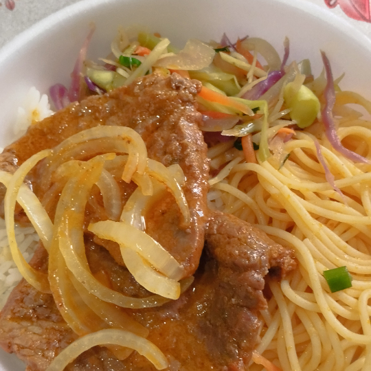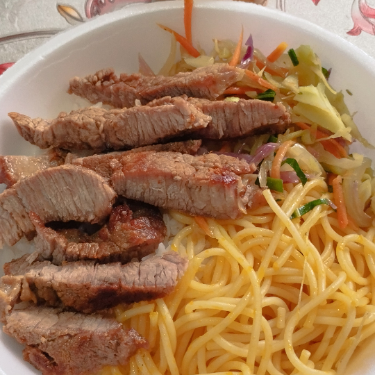 Alcatra, arroz, macarrão, feijão e farofa.