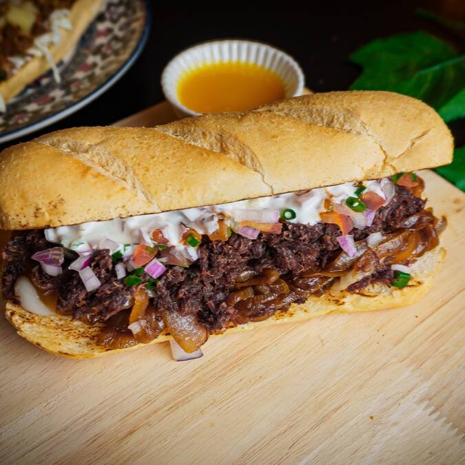 Pão Francês 15cm, charque desfiado preparado na pressão, cebola caramelizada, vinagrete e molho da casa.