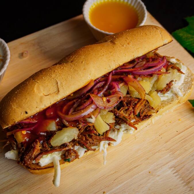 Pão Francês 15cm, Pernil desfiado, preparado com muito limão, barbecue da casa, cebola roxa em conserva e maionese de repolho.