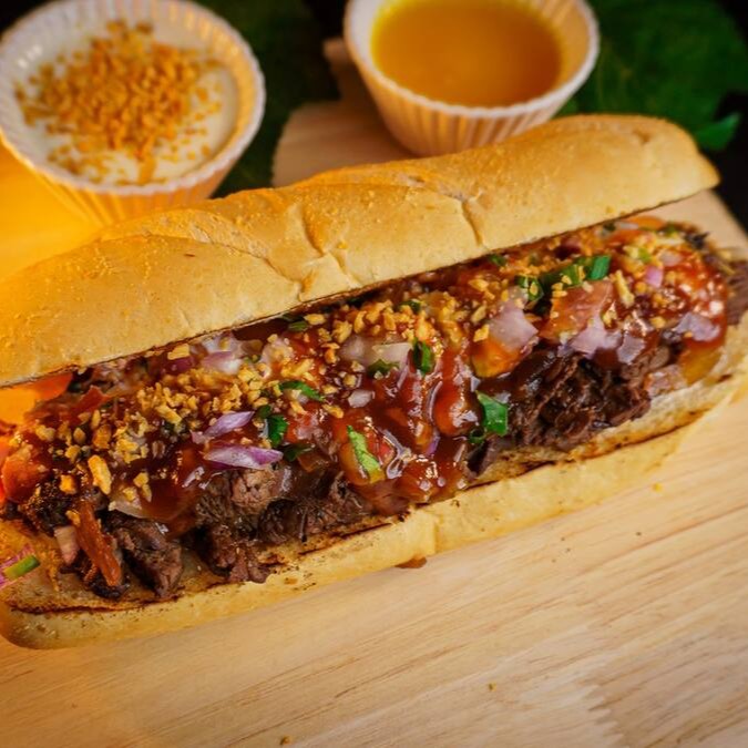 Pão Francês 15cm, Fraldinha preparada em um delicioso molho barbecue da casa, cebola caramelizada, alho frito e vinagrete.