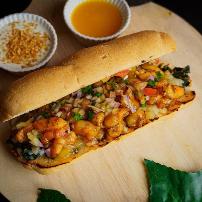 Pão Francês 15cm, Camarões Rosa selados no alho e azeite, abacaxi caramelizado, jambu, redução de tucupi e vinagrete.