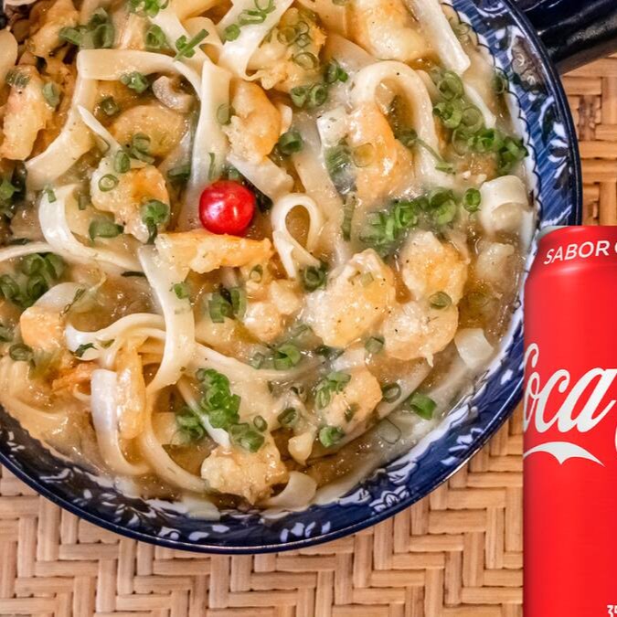 Camusquim de camarão rosa, feito com espaguete e molho da casa com camarão rosa + coca cola lata