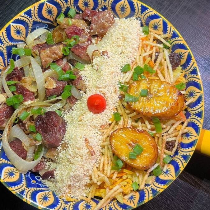 Deliciosa combinação de Charque acebolado com Risoto, banana da terra e farofa.