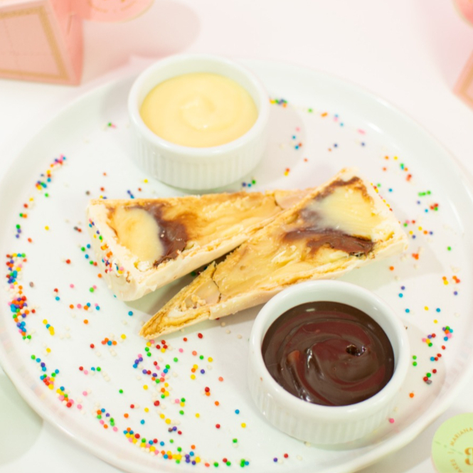 Fatia de torta, massa de chocolate 50%, com creme de ninho e nutella