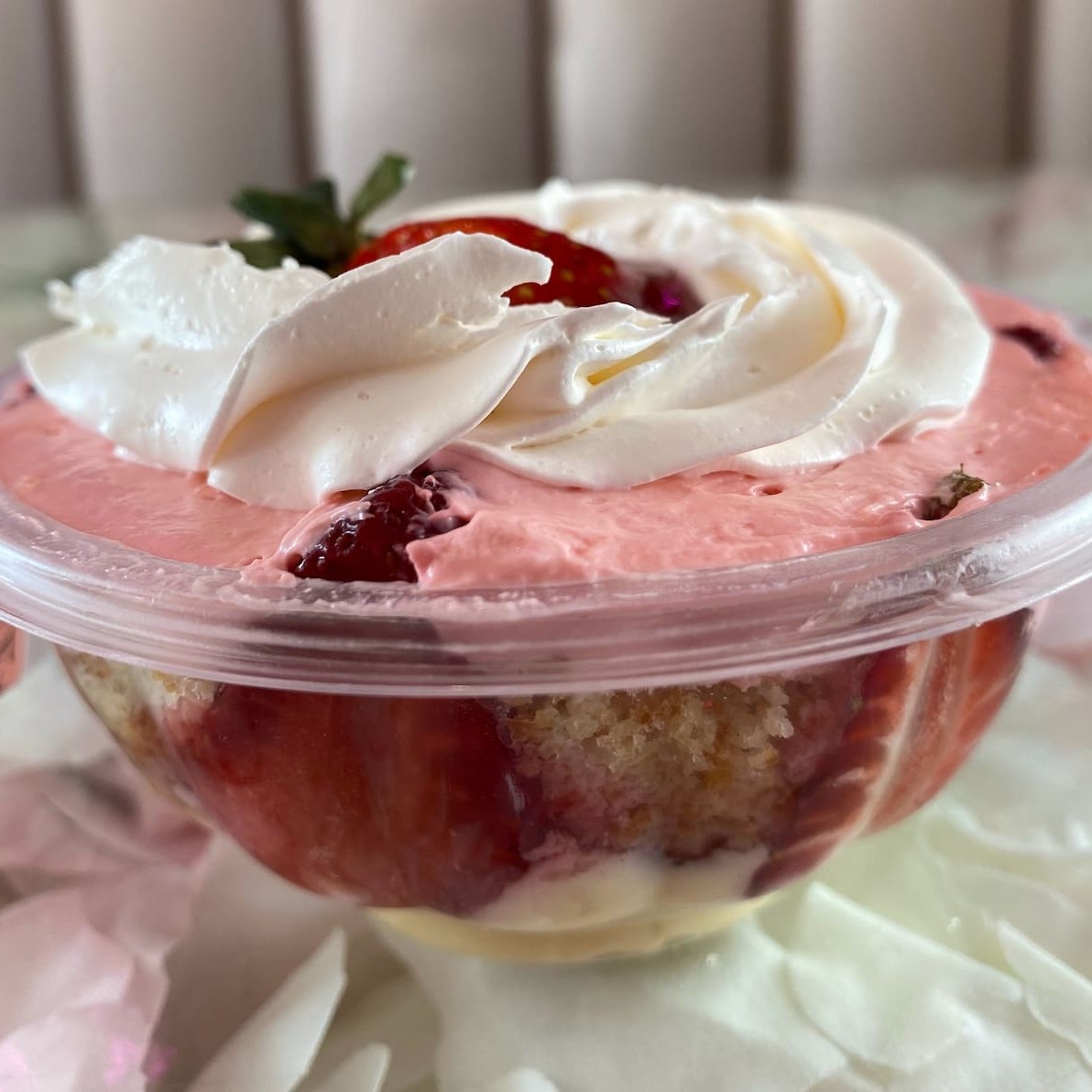 Copo de bolo red velvet, com creme de ninho e geleia de morango