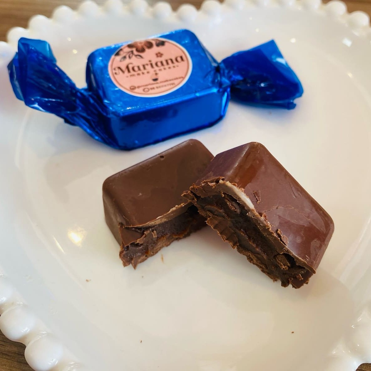 Cubo de brownie coberto com recheio de casadinho(brigadeiro de chocolate ao leite e brigadeiro de ninho)