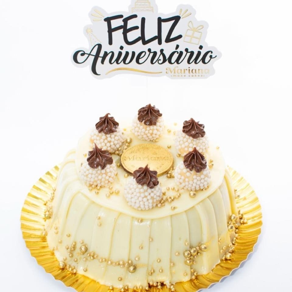 Bolo de 15 cm massa branca, cobertura brigadeiro com brigadeiro branco. Recheio transborda quando o bolo é cortado. Serve em média 8 a 10 fatias. Bolo acompanha vela e plaquinha de feliz aniversário!