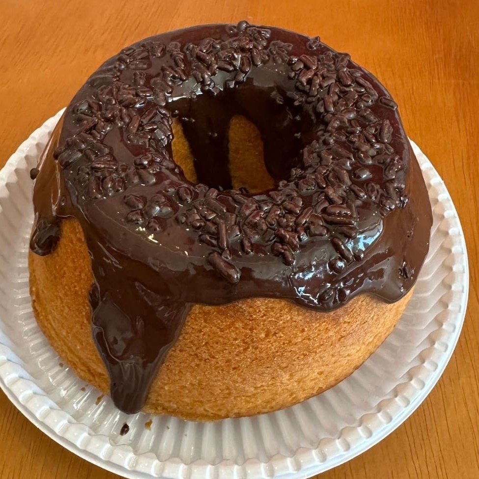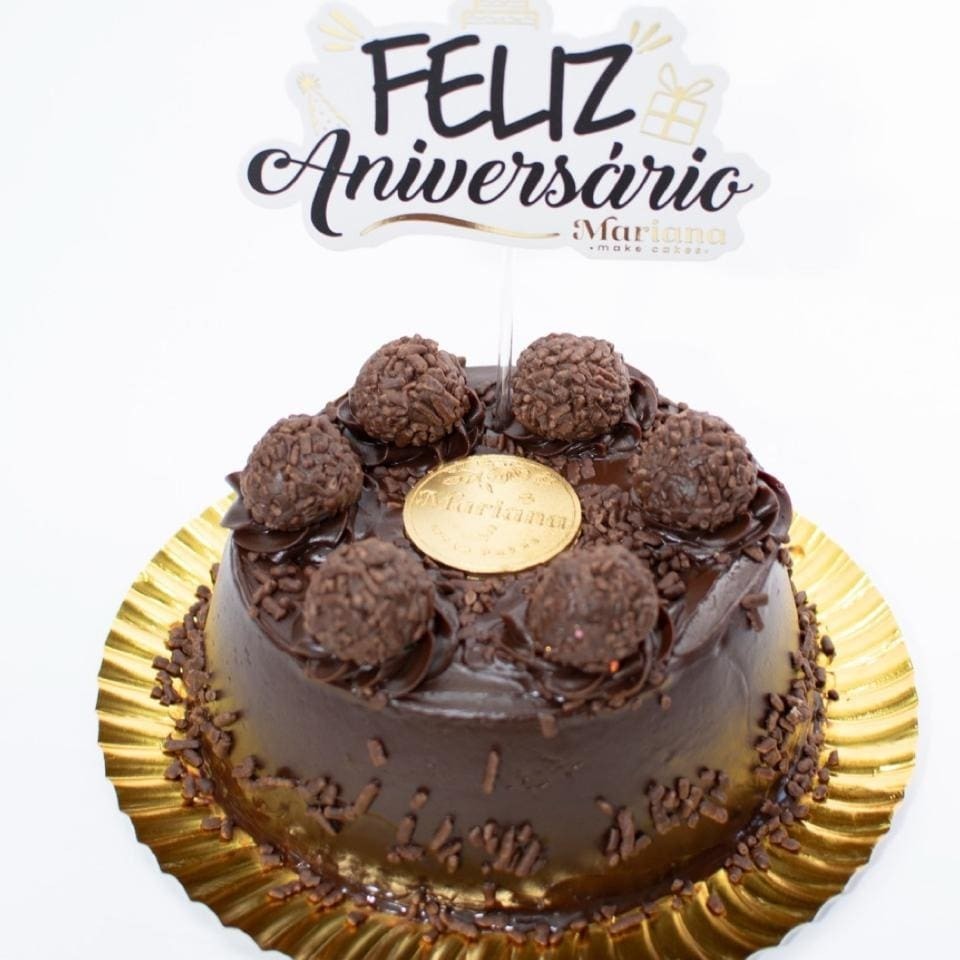 Bolo de 15 cm massa branca, cobertura brigadeiro. Recheio dentro do buraco do bolo. Serve em média 8 a 10 fatias. Bolo acompanha vela e plaquinha de feliz aniversário!