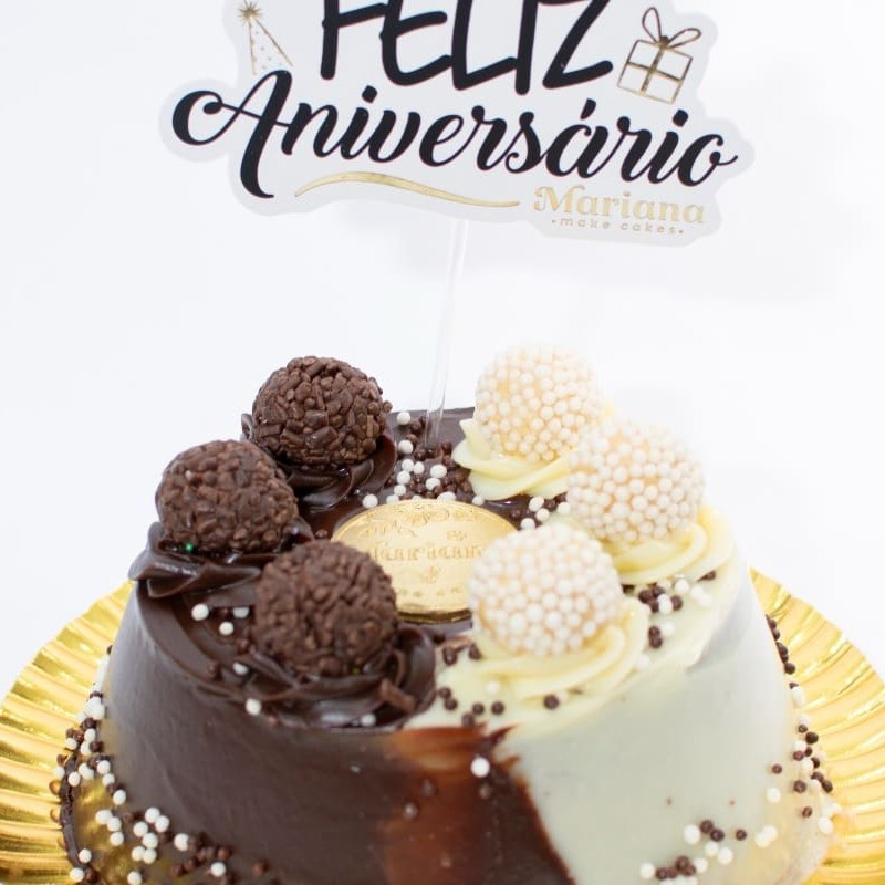 Mini bolo tamanho 8cm, massa branca e recheio de brigadeiro preto e brigadeiro branco. Embalado em embalagem para presente, acompanha 1 velinha.