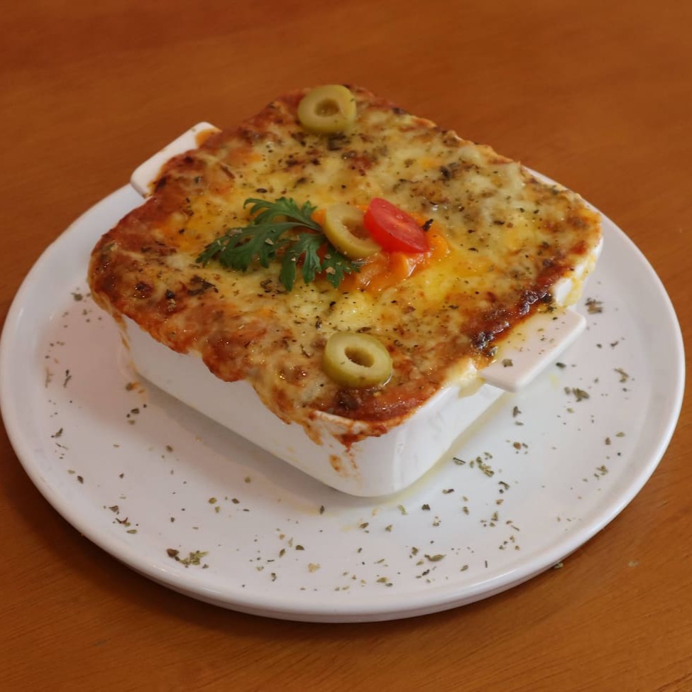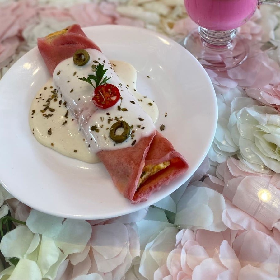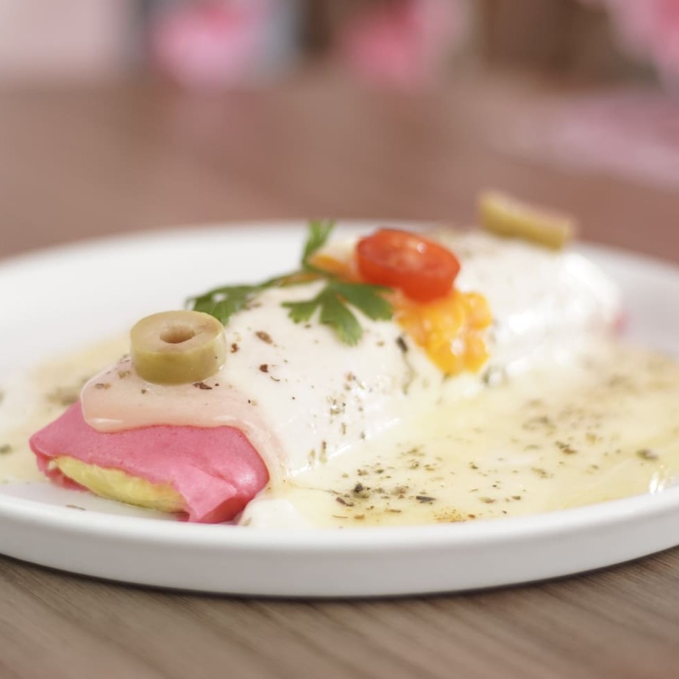 Panqueca recheada de carne moída com molho branco na cobertura.