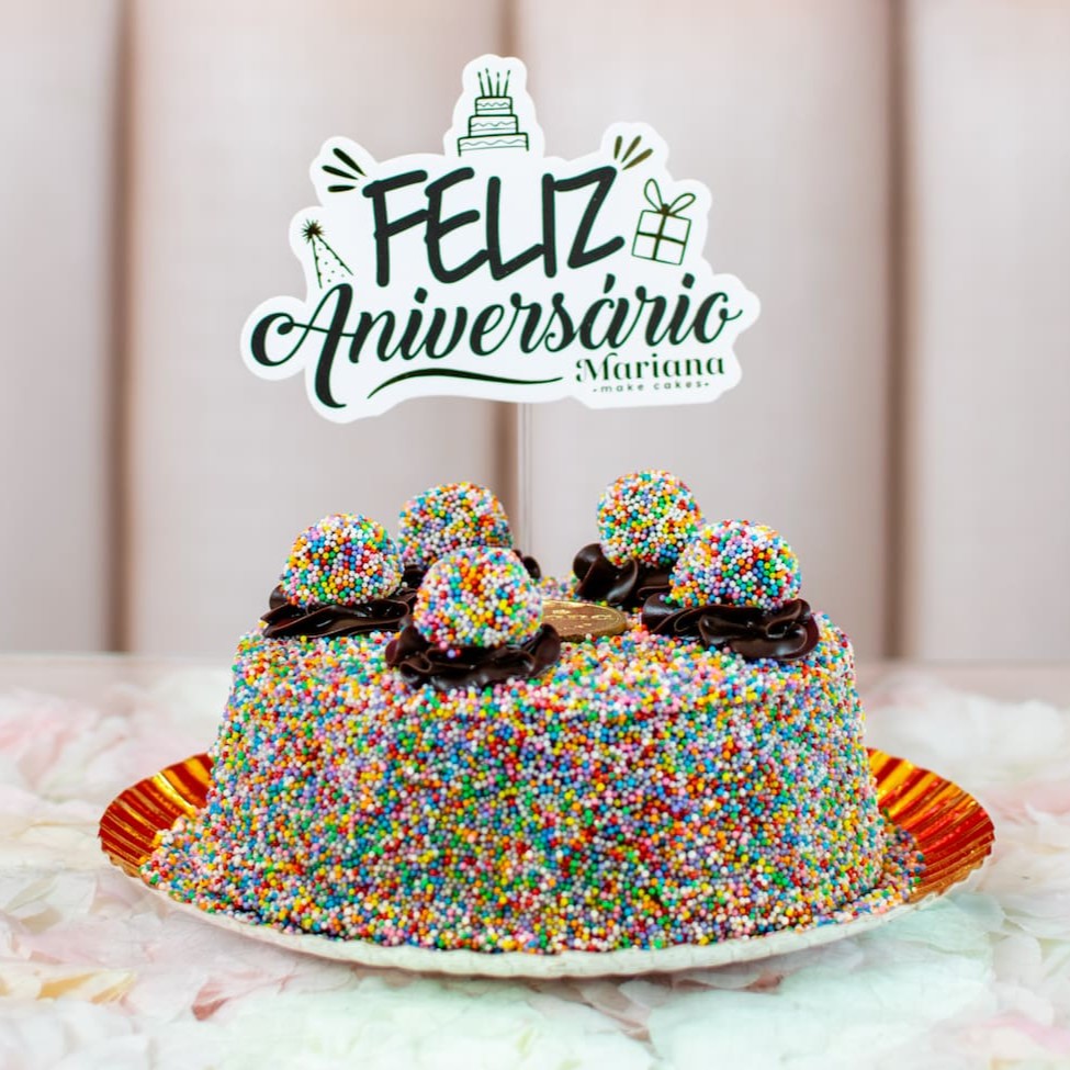 Bolo de 15 cm massa branca, cobertura brigadeiro com confetes coloridos. Recheio transborda quando o bolo é cortado. Serve em média 8 a 10 fatias. Bolo acompanha vela e plaquinha de feliz aniversário!