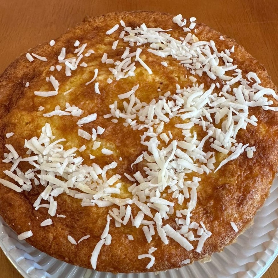 Sobremesa com creme de ninho, bolo e pedaços de abacaxi