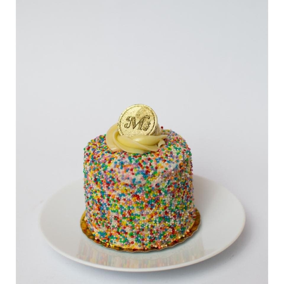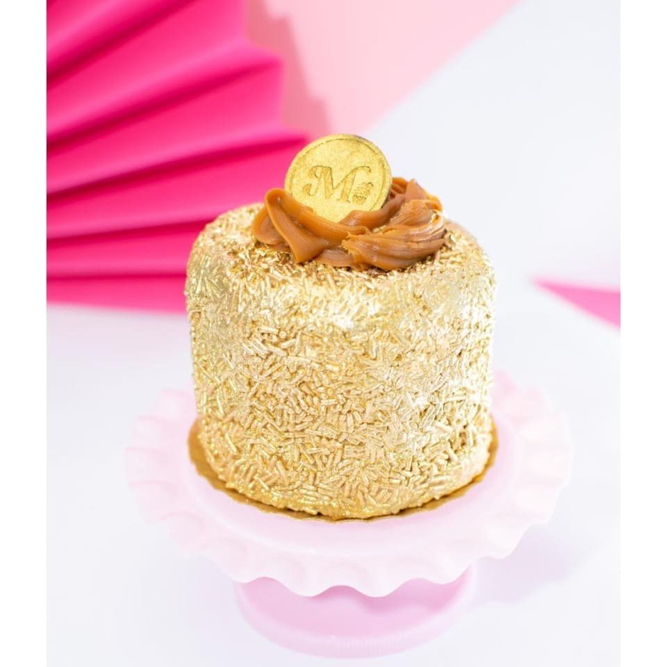 Mini bolo tamanho 8cm, massa branca e recheio de doce de leite. Embalado em embalagem para presente, acompanha 1 velinha.