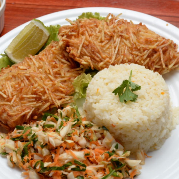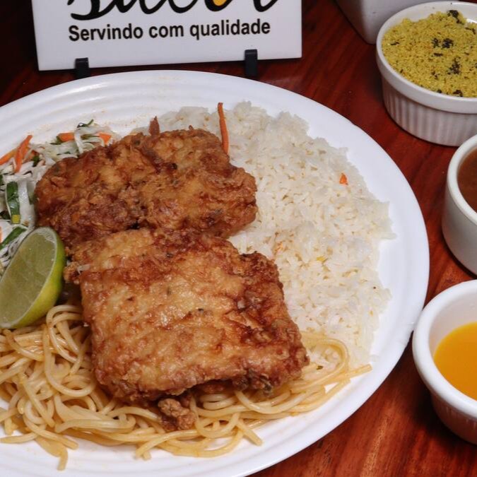 130 á 140g de filé de pescada, acompanhado de arroz, tropeiro, salada e farofinha