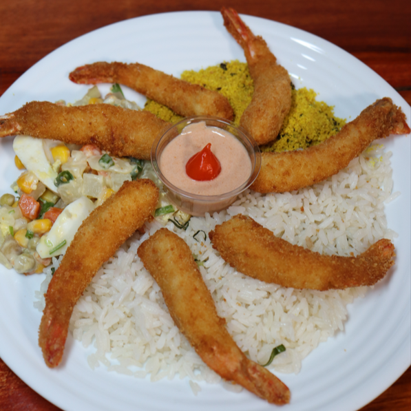 Camarão Rosa empanado na farinha panko, acompanhado de arroz, tropeiro, salada e farofinha vai separada.