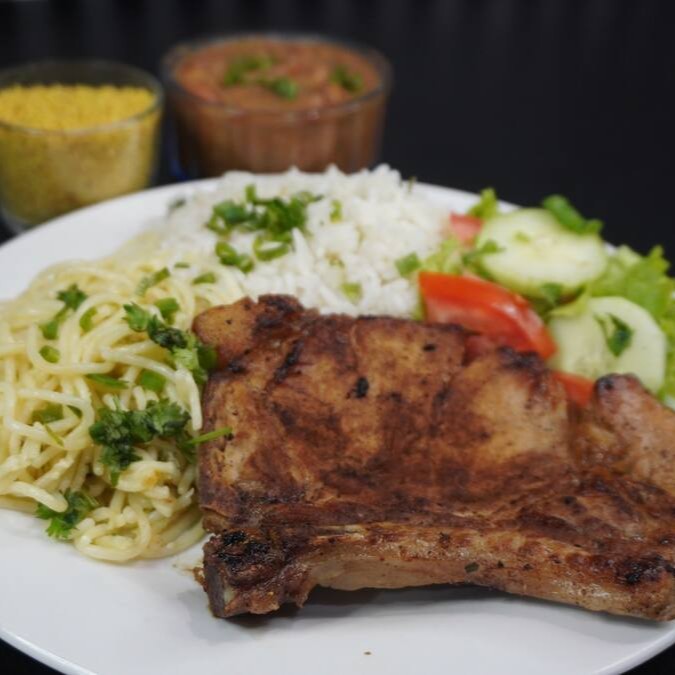 Experimente a Bisteca de Porco, uma combinação perfeita de arroz, macarrão, salada, farofa, feijão, que traz um sabor irresistível e tradicional.