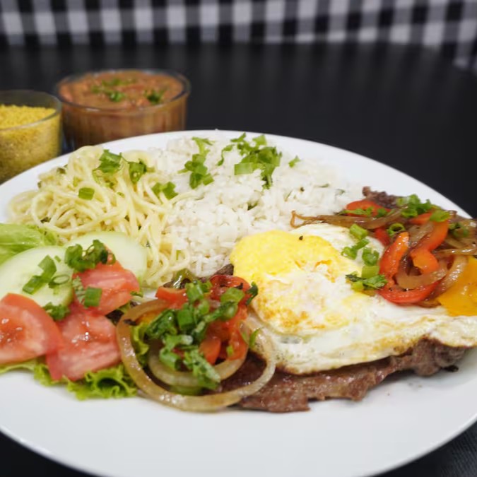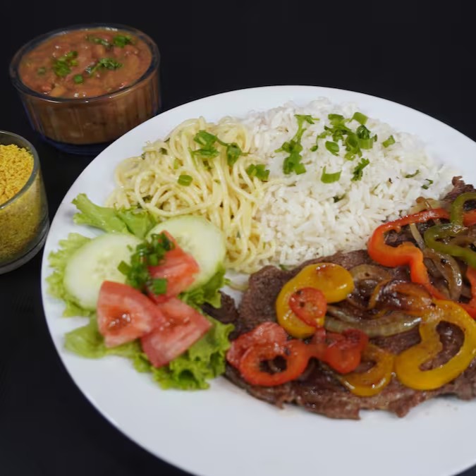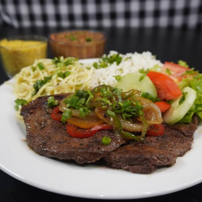 Experimente nosso bife acebolado, suculento e bem temperado, perfeito para quem aprecia sabores intensos. Acompanha arroz, macarrão, farofa, salada e feijão.