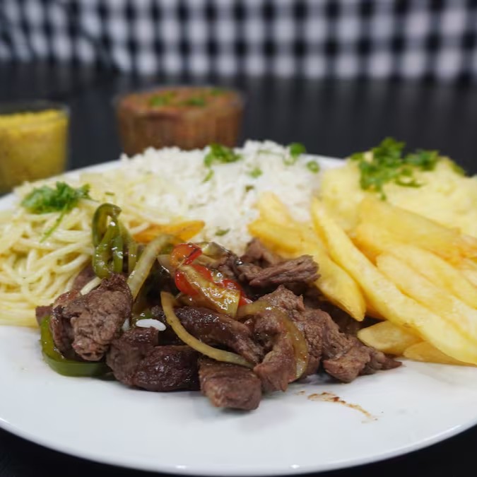 Delicie-se com nosso suculento Bife à Cavalo, acompanhado de arroz soltinho, macarrão saboroso, salada fresca, farofa crocante, feijão bem temperado