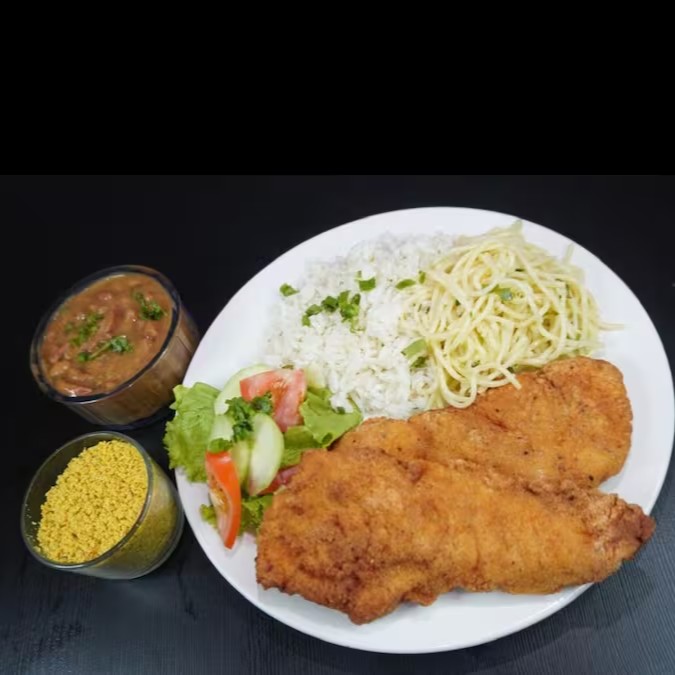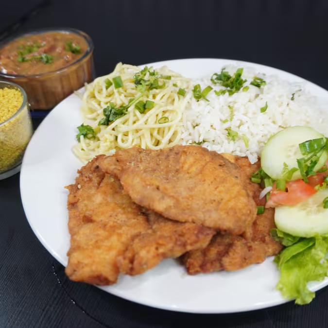 Delicie-se com nosso frango empanado, acompanhado de arroz soltinho, macarrão saboroso, salada fresca, farofa crocante e feijão bem temperado.