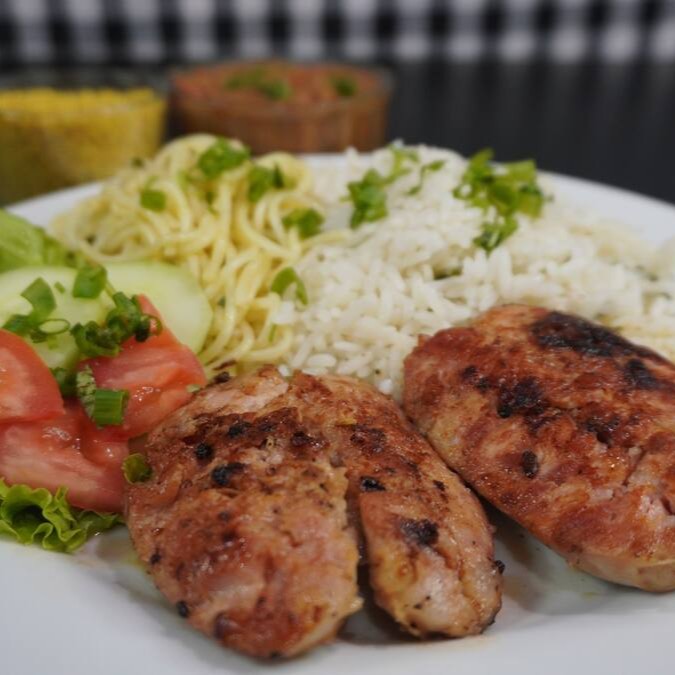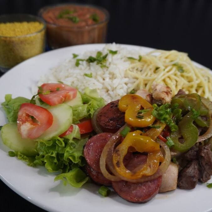 Aprecie a Toscana na Chapa, acompanhada de arroz, macarrão, salada, farofa e feijão, oferecendo um toque especial e saboroso ao seu paladar.