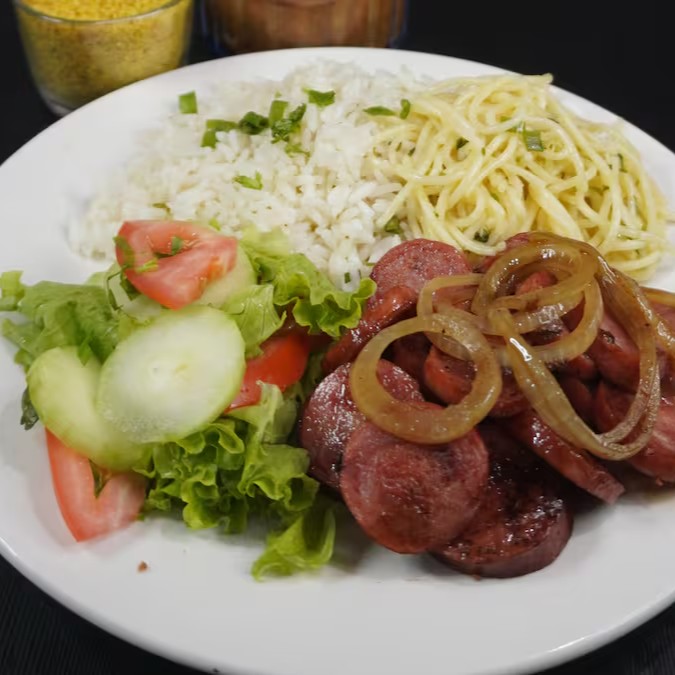 Saboreie a Calabresa Acebolada, servida com arroz, macarrão, salada, farofa e feijão, proporcionando uma experiência gastronômica rica e marcante.