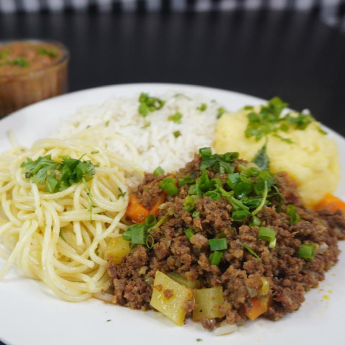 Desfrute da Chapa Mista, uma seleção variada com arroz, macarrão, salada, farofa e feijão, perfeita para quem busca diversidade e sabor.