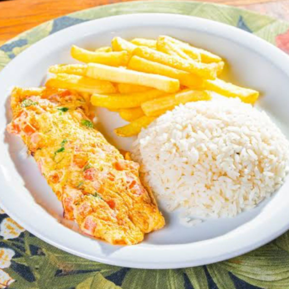 Experimente nosso omelete, uma opção leve e saborosa. Acompanha arroz, macarrão, fritas, farofa e feijão, para uma refeição completa e deliciosa.