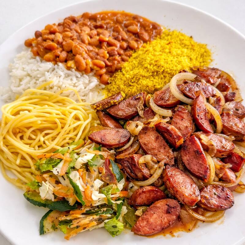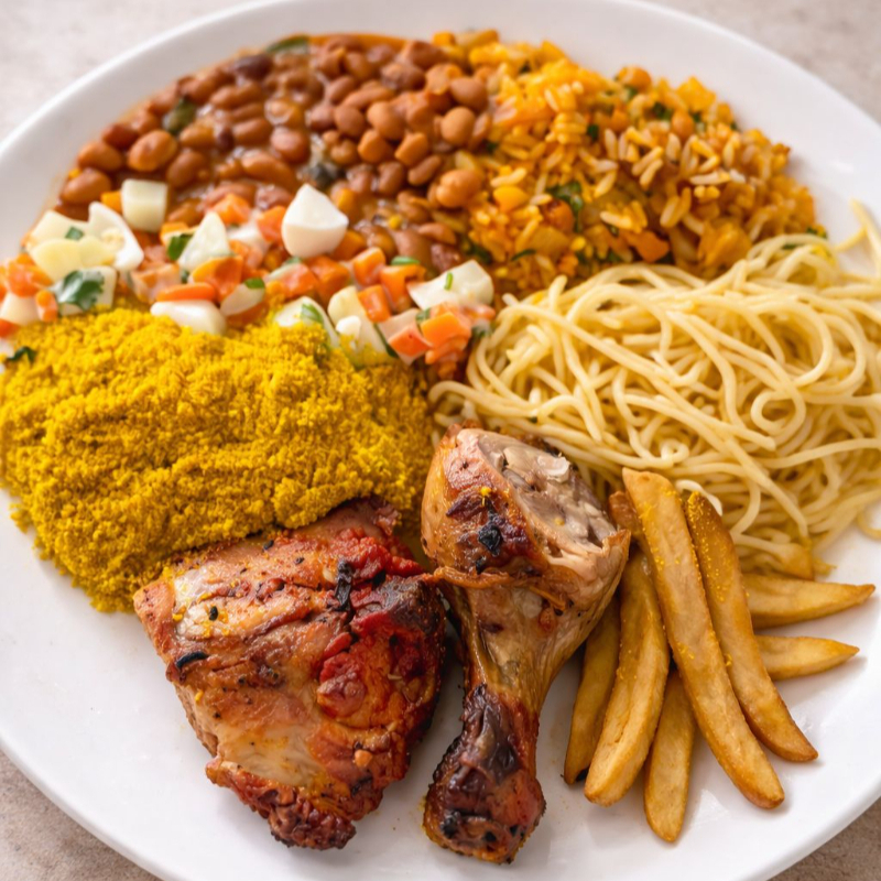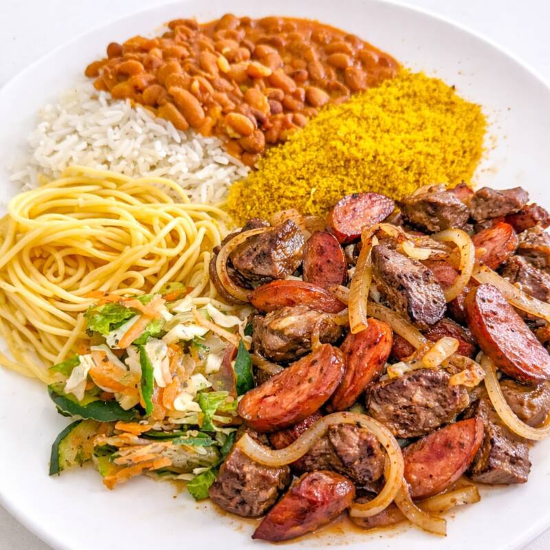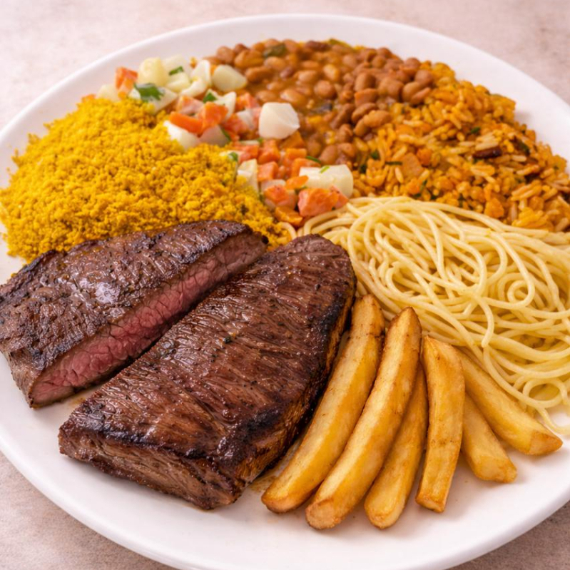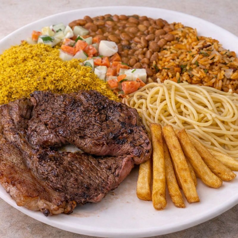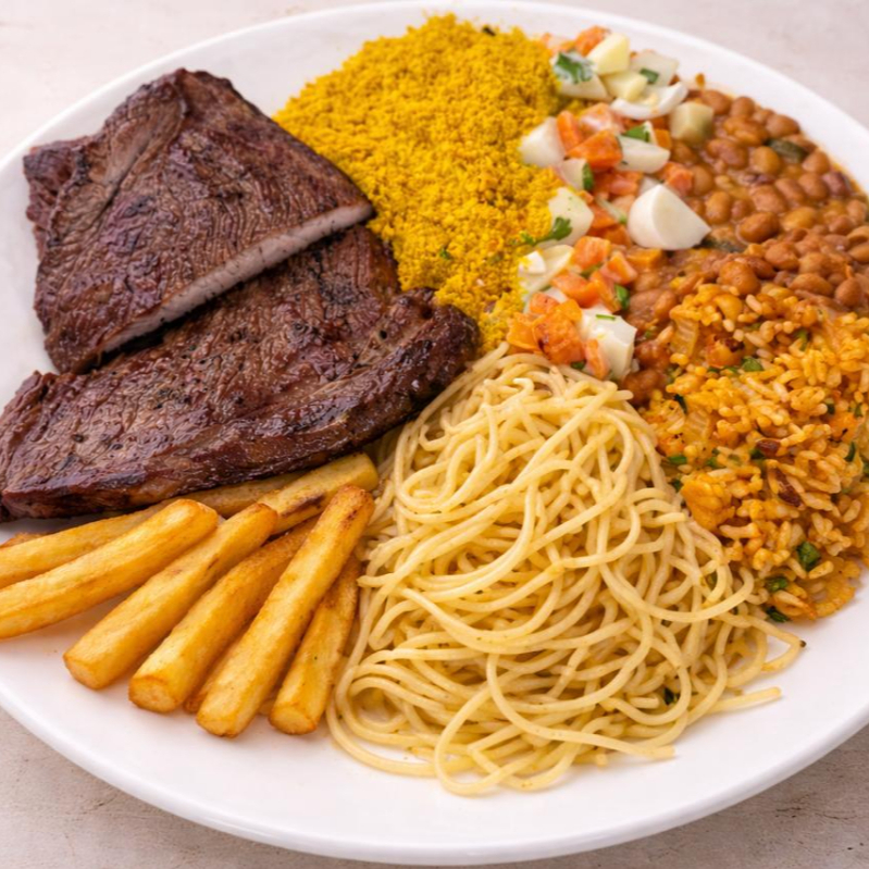Acompanha: Baião, macarrão, feijão, fritas, farofa e salada de maionese.