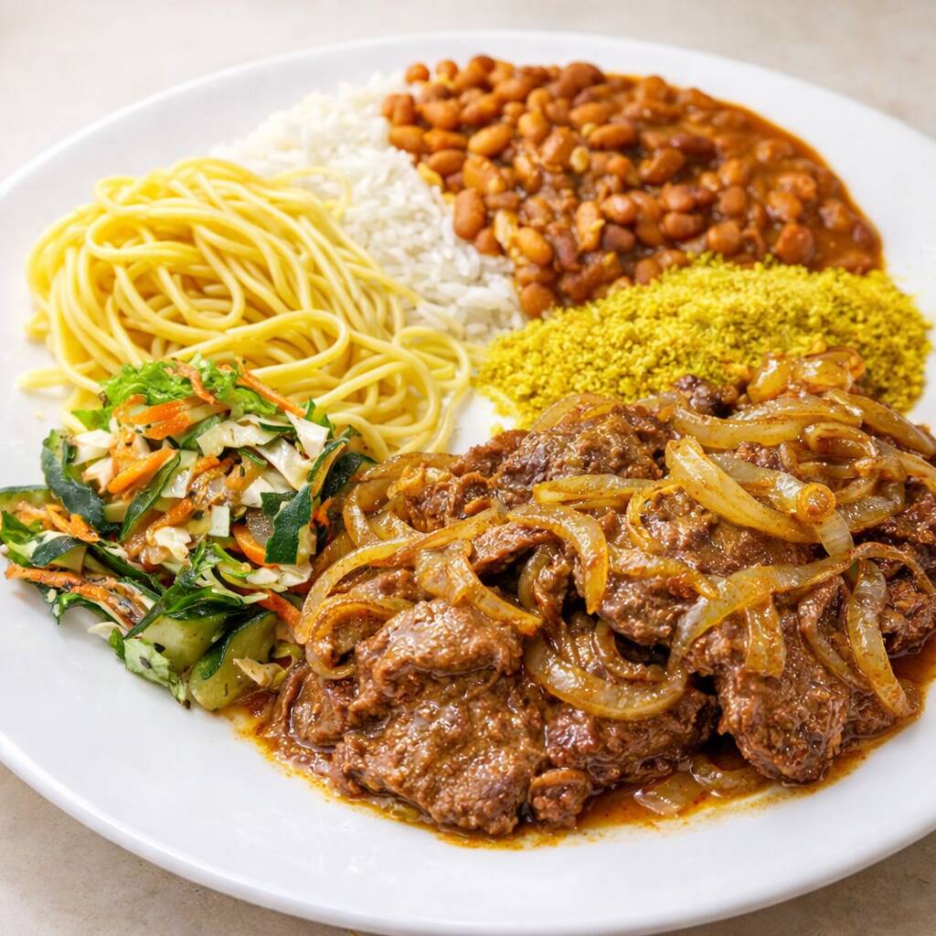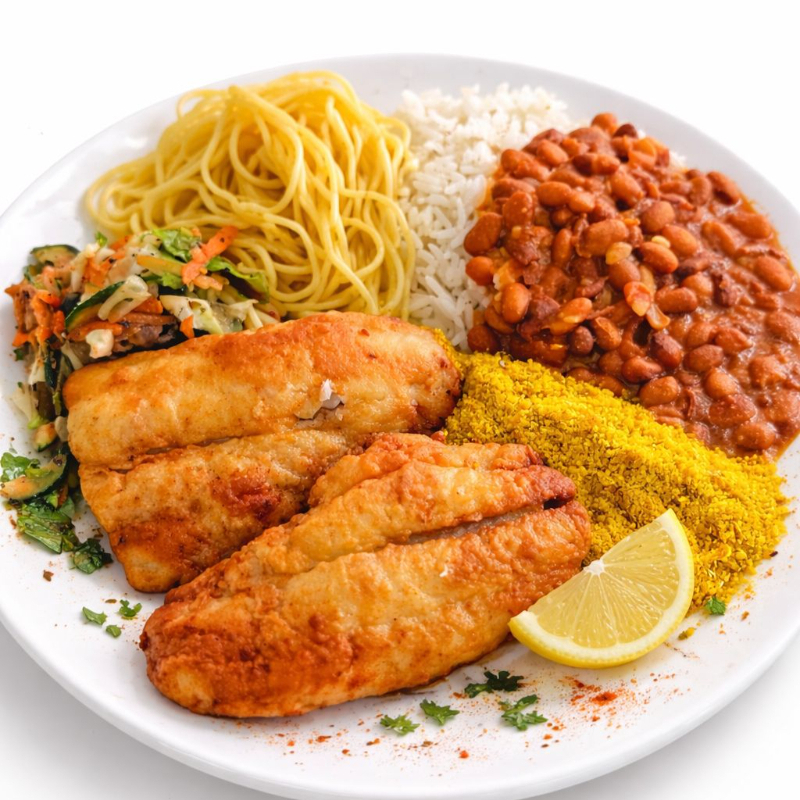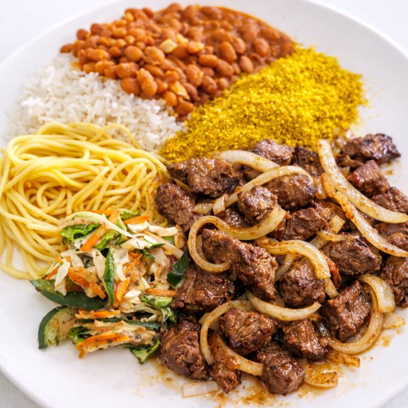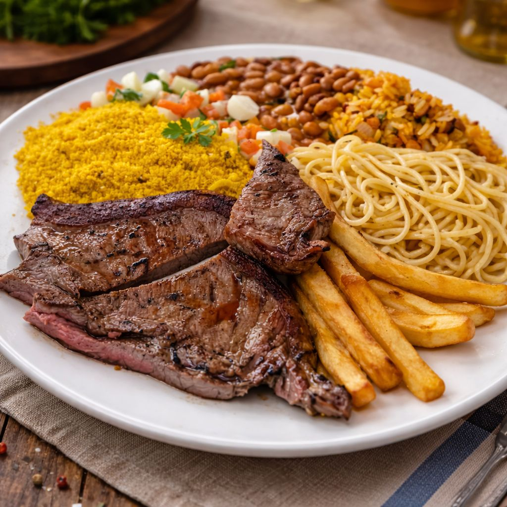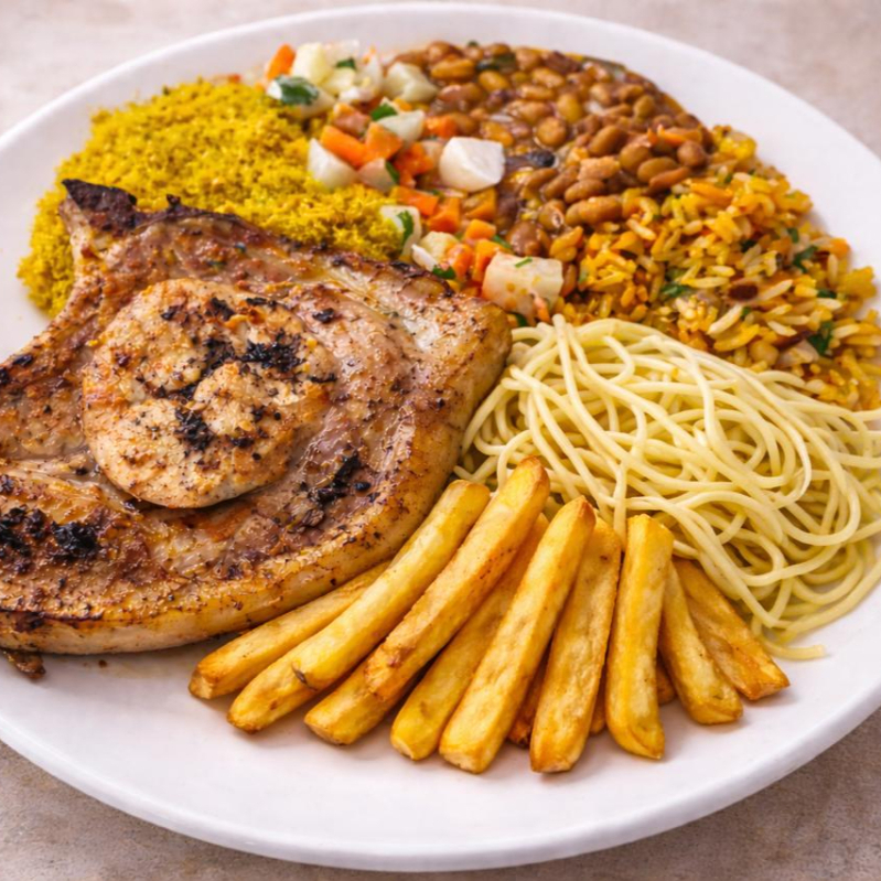 Acompanha: Baião, macarrão, feijão, fritas, farofa e salada de maionese.