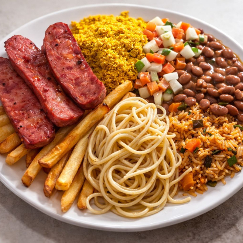 Acompanha: Baião, macarrão, feijão, fritas, farofa e salada de maionese. 600g