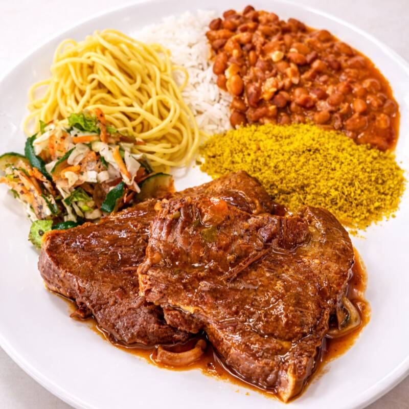 Acompanha: Arroz, macarrão, feijão, farofa e salada verde. 500g