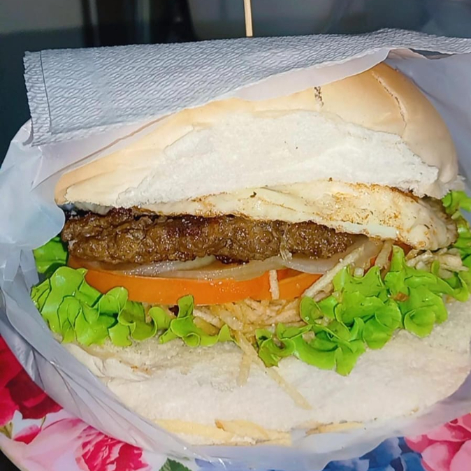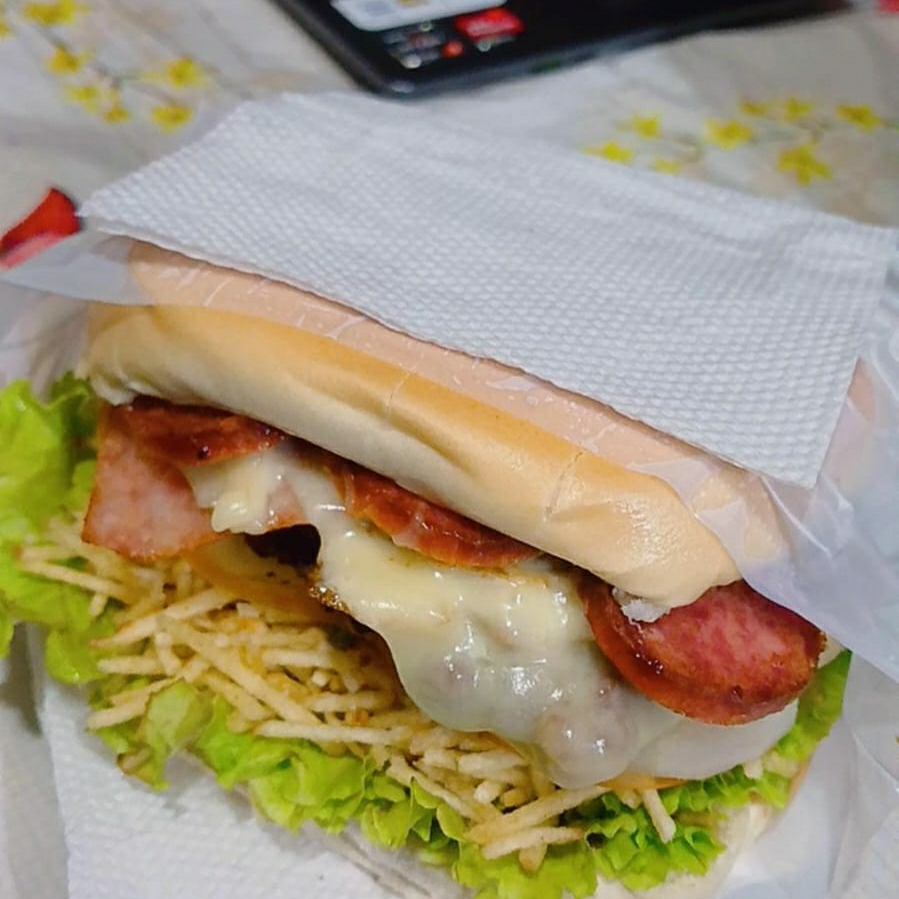 Pão, carne, calabresa, ovo, queijo, presunto, alface, tomate, pepino e batata palha