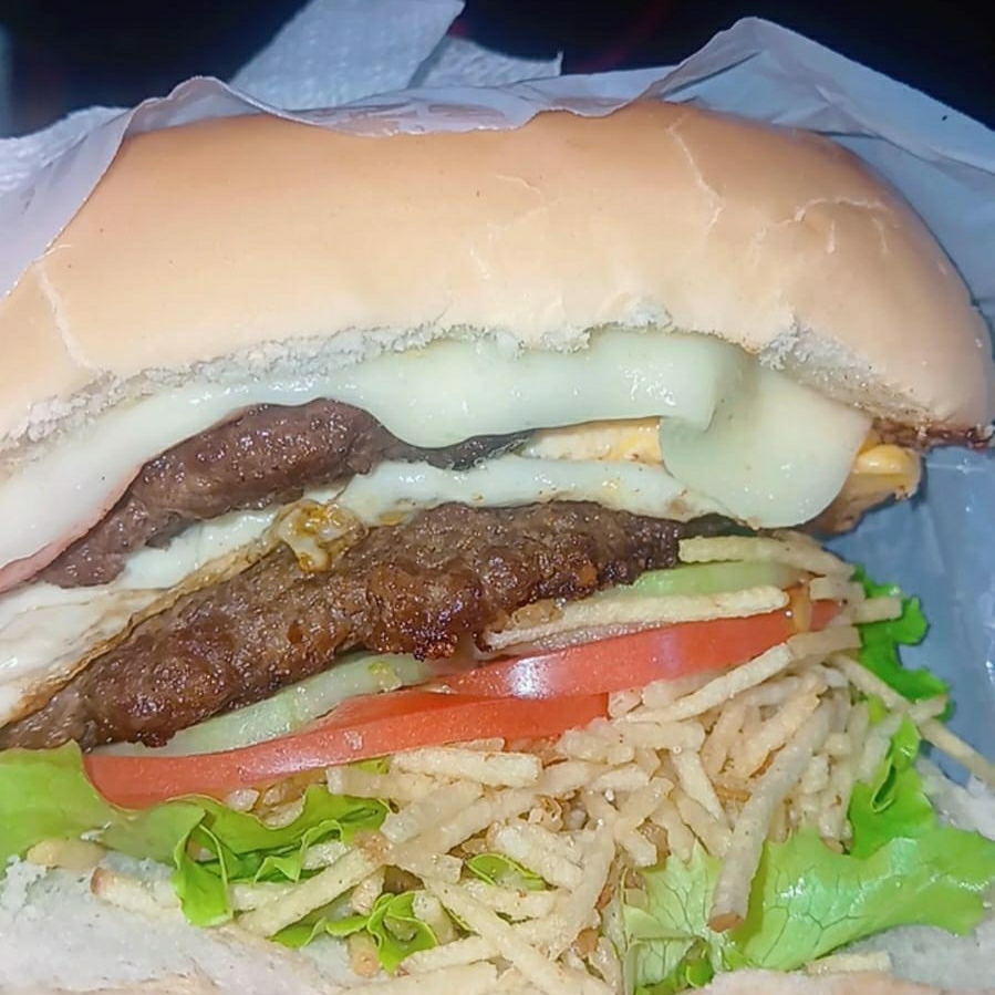 Pão, 2 carnes, ovo, 2 queijos, 2 presuntos, alface, tomate, pepino e batata palha