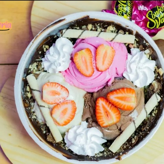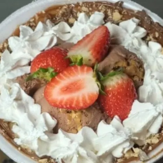 Da taça para o isopor, uma deliciosa camada de brigadeiro gourmet no fundo com pedaços de bombons Sonho de Valsa, 3 bolas de sorvete a sua escolha e cobertura.