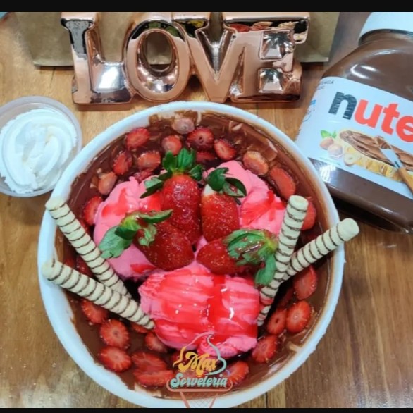 Nutella, Morangos e Sorvete. A ideia é a mesma das outras taças, mas é feita com ingredientes especiais. Nutella preenchendo o fundo e morangos frescos complementam o sabor.
